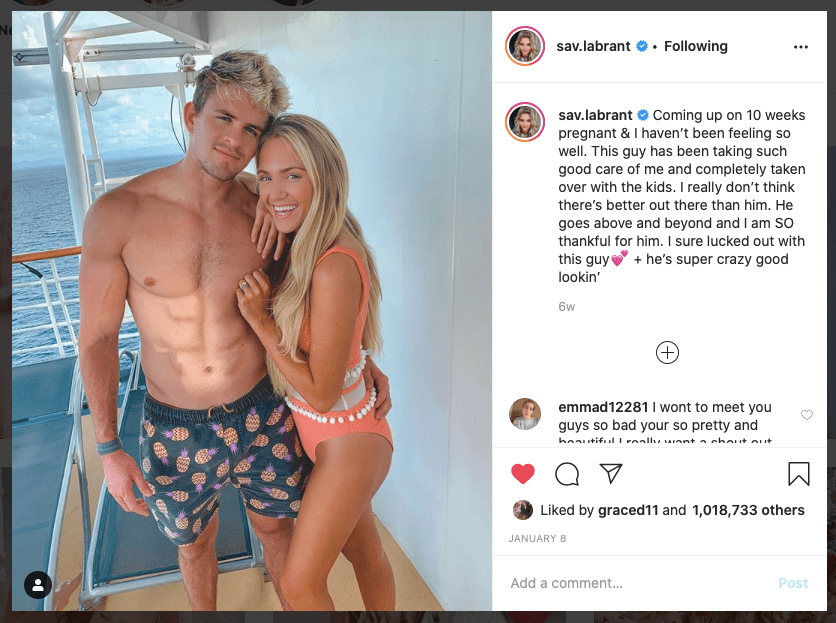 After looking at her profile it is filled with photos of herself, her husband, and her children mostly. We can see gender roles at play in many of her posts and I’ve provided some as examples. Below is a post of Savannah and her husband Cole. In the photo, Cole looks very manly with his shirt off and abs showing. He is holding his wife, Savannah, on his arm while she looks very feminine and cuddled up to him. Their positioning in this photo is clearly showing gender roles as Cole looks like the tough man who protects his wife. In the caption we see that she is talking about how she is pregnant and how her pregnancy is going. That alone is very feminine and on top of that she is thanking her husband for taking such good care of her while she is pregnant. This reinforces that she is being taken care of by her husband while she carries his child. She also talks about how good looking he is in this post.